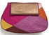 by Mad Imports. This woven clutch features colorblocked raffia in bright hues accented by a chunky wood button.